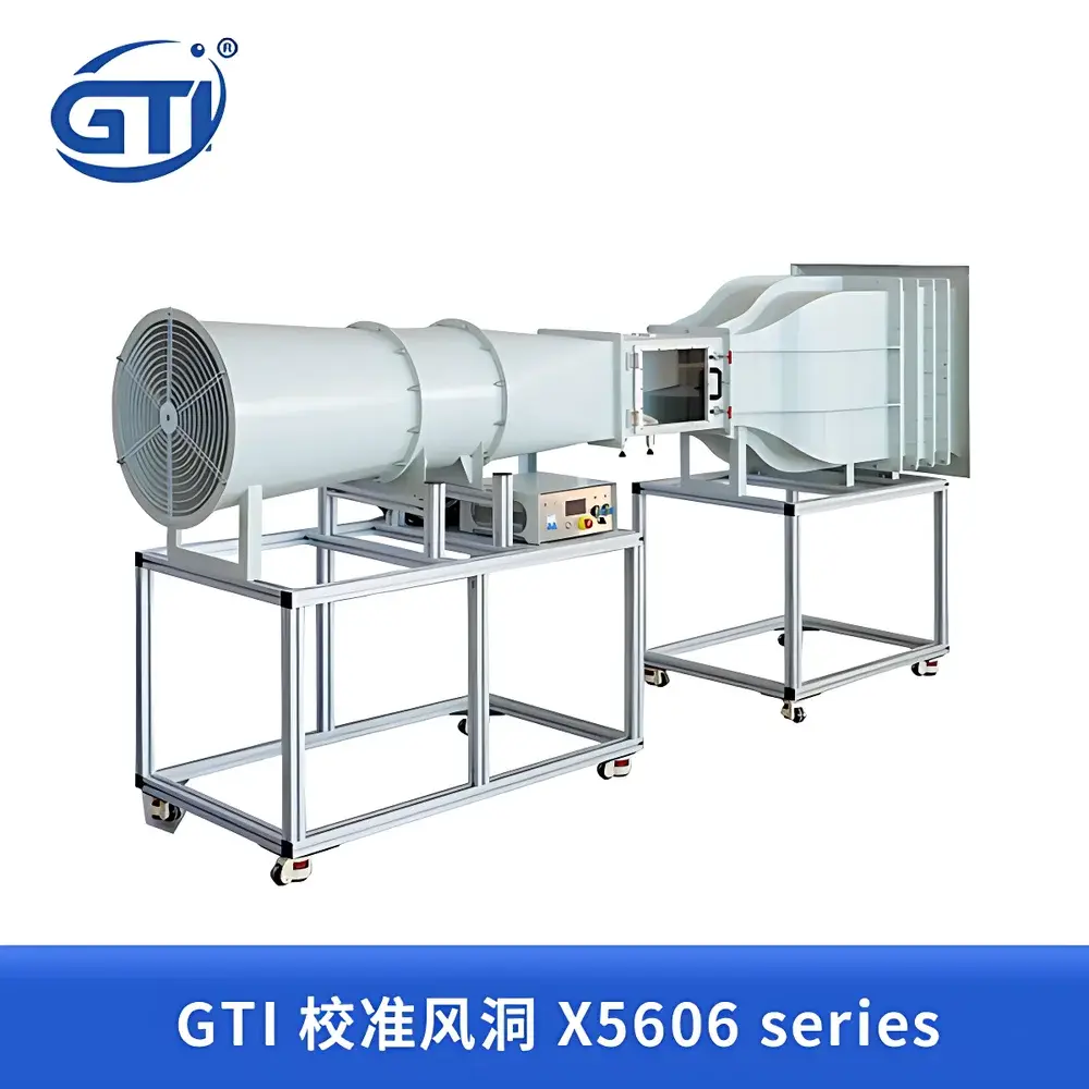 The GTI X5606 Series Calibration Wind Tunnel is a precision-engineered, low-speed, closed-circuit direct-current wind tunnel designed for metrological validation and periodic calibration of air velocity sensing instruments. It operates on fundamental principles of fluid dynamics and controlled laminar-to-turbulent transition management, enabling traceable airflow generation across a calibrated range of 0.1 to 30 m/s. Unlike generic airflow test rigs, the X5606 Series integrates computational fluid dynamics (CFD)-guided structural optimization—applied to the contraction section, honeycomb flow straightener, and test section geometry—to achieve ≤1% flow uniformity and ≤0.5% temporal stability under steady-state operation. Its compact footprint (~3 m × 0.8 m × 1.6 m) and modular mechanical architecture support integration into ISO/IEC 17025-accredited calibration laboratories, national metrology institutes, and OEM quality assurance facilities where space-constrained, high-reproducibility airflow reference standards are required.