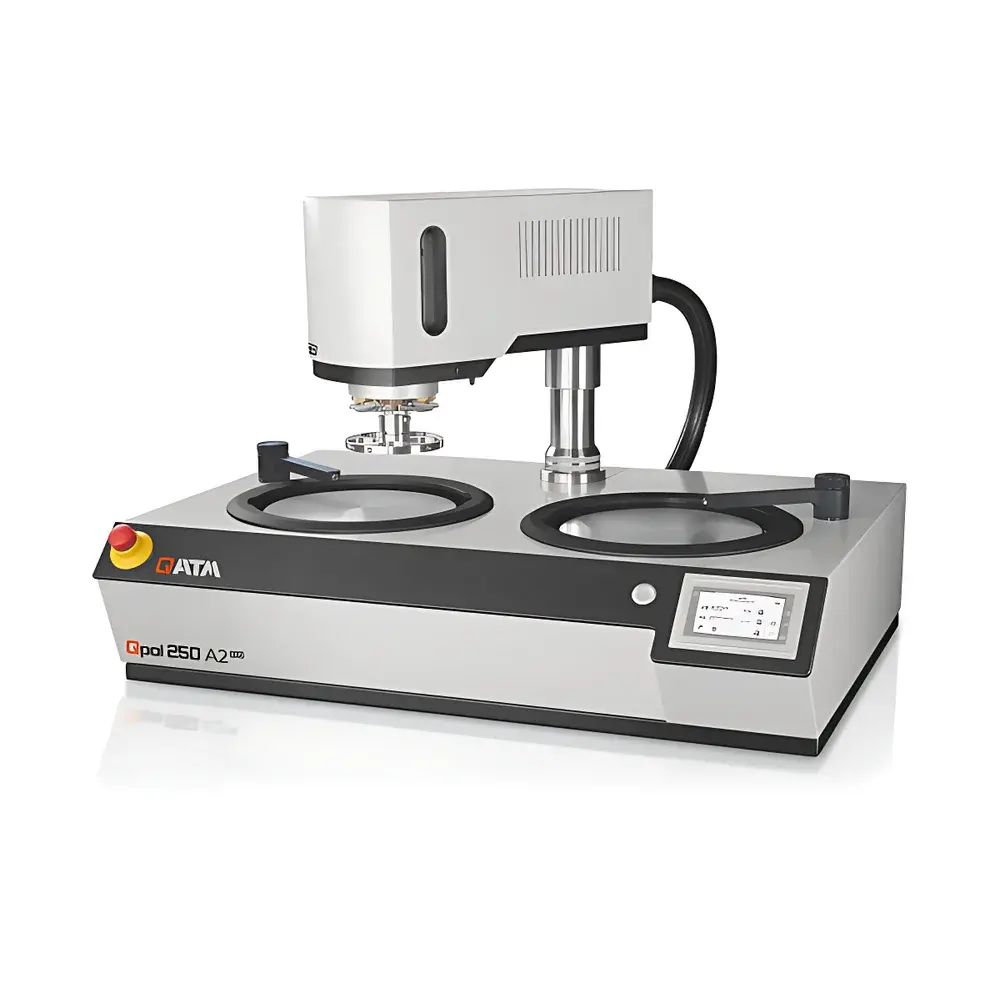 The QATM Qcut 500 A is a high-precision vertical abrasive cut-off machine engineered for reproducible, operator-safe metallographic sample preparation in industrial quality control laboratories and R&D facilities. Designed as the successor to the ATM BRILLANT 275 platform, it employs a robust cast-aluminum monocoque frame with powder-coated finish and integrates water-cooled 15 kW spindle drive directly into the swiveling arm — eliminating belt-driven transmission losses and enhancing torque stability across the full speed range (1000–2800 rpm). Its core cutting principle relies on controlled abrasive wheel engagement under programmable force modulation, utilizing wet-cutting methodology compliant with ISO 1127 and ASTM E3 for metallurgical specimen sectioning. The machine supports both manual and fully automated operation modes, with all motion axes (X, Y, and optional Z) driven by high-torque servo motors and precision ground ball screws, ensuring sub-millimeter repeatability in multi-step cutting sequences.